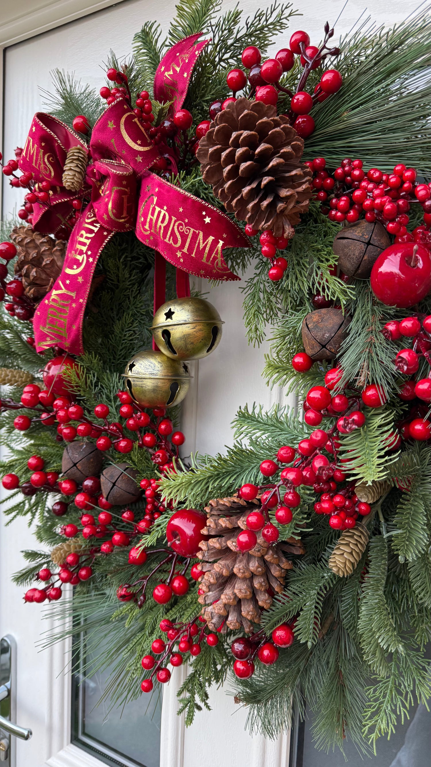This stunning wreath made using high quality artificial foliage, berries, rustic bells and pinecones and finished with a hand tied bow. Handmade on a grapevine base