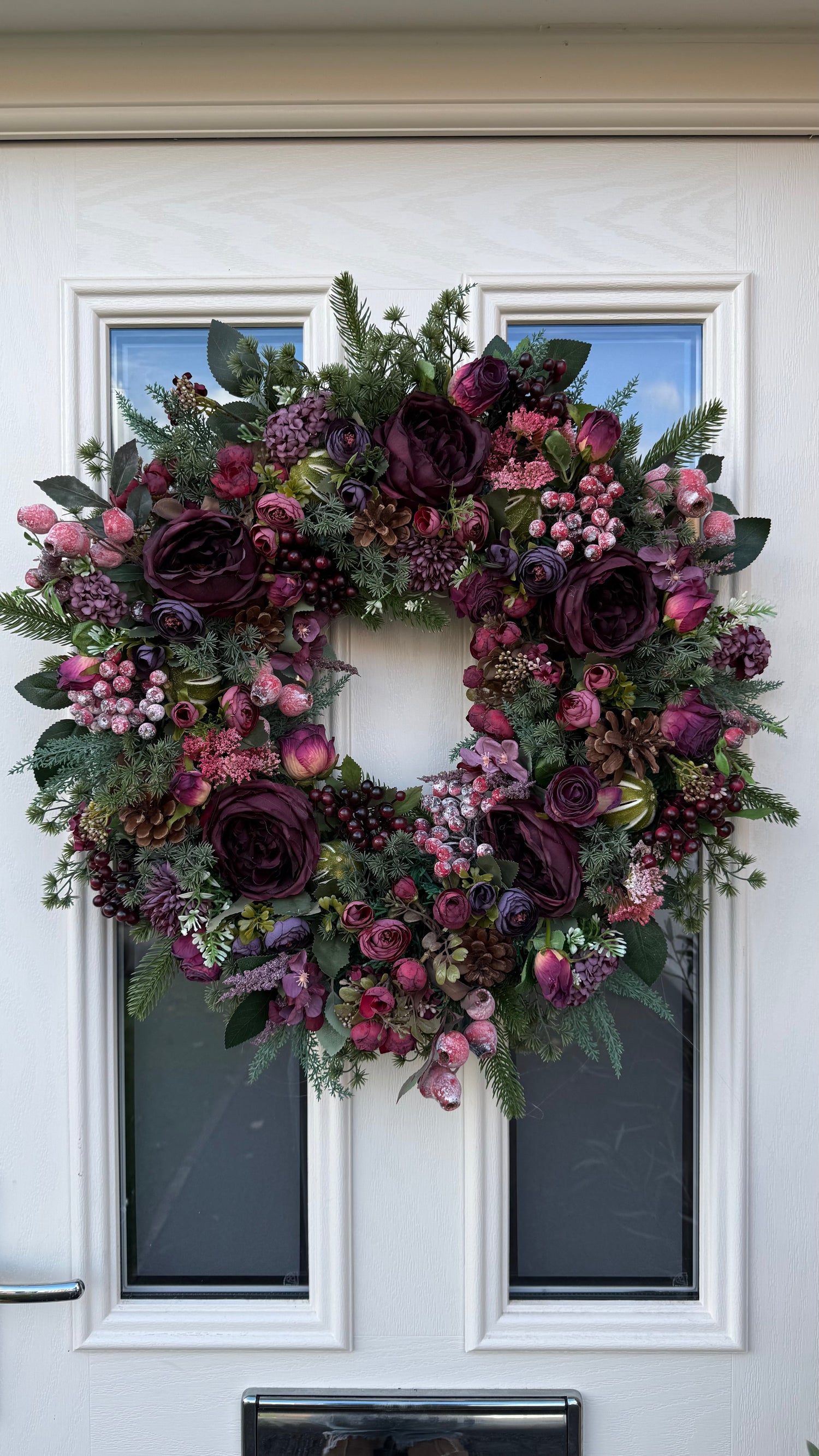 This stunning wreath is handcrafted using high quality artificial flowers and foliage. Handmade on an evergreen base.