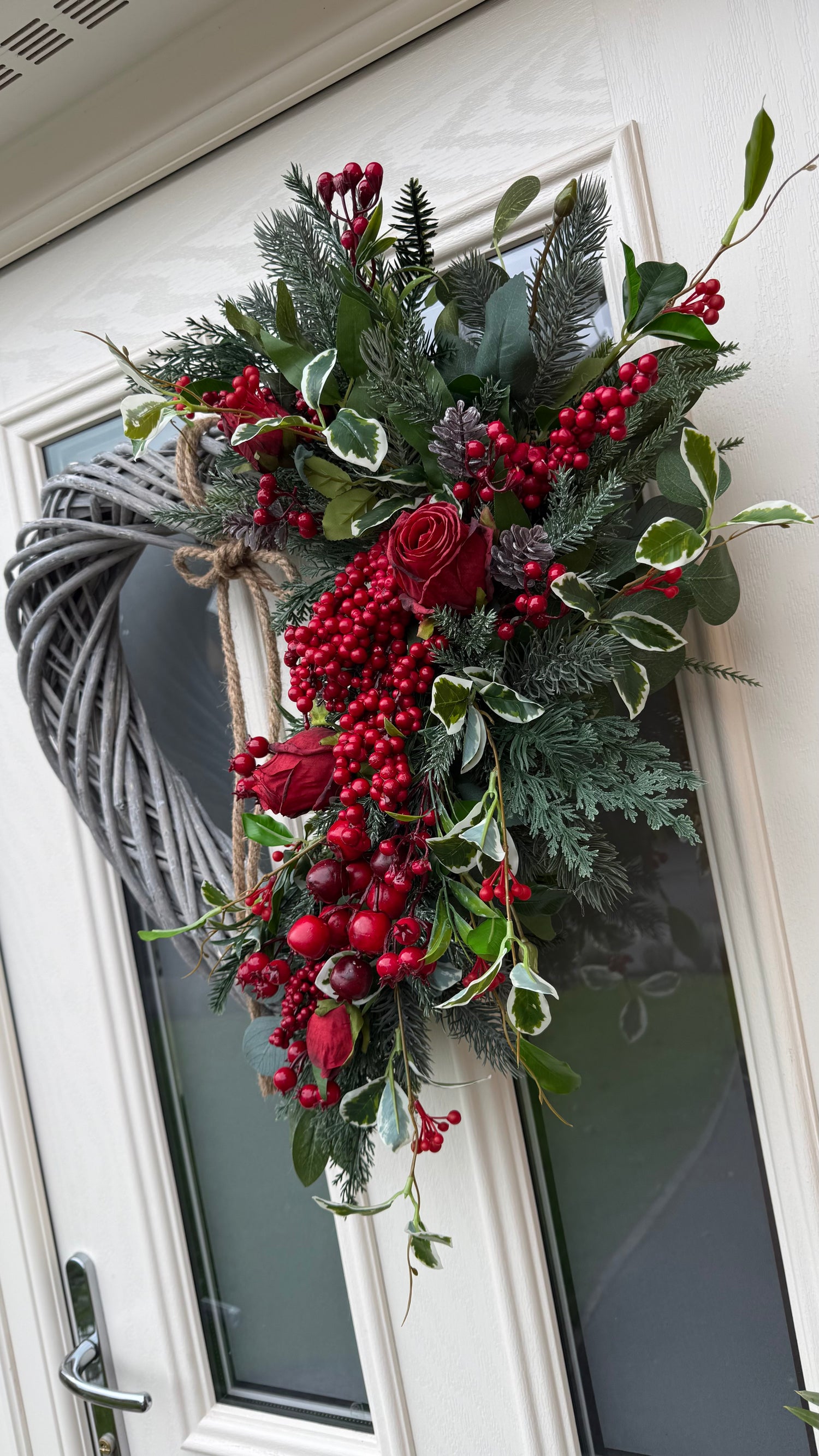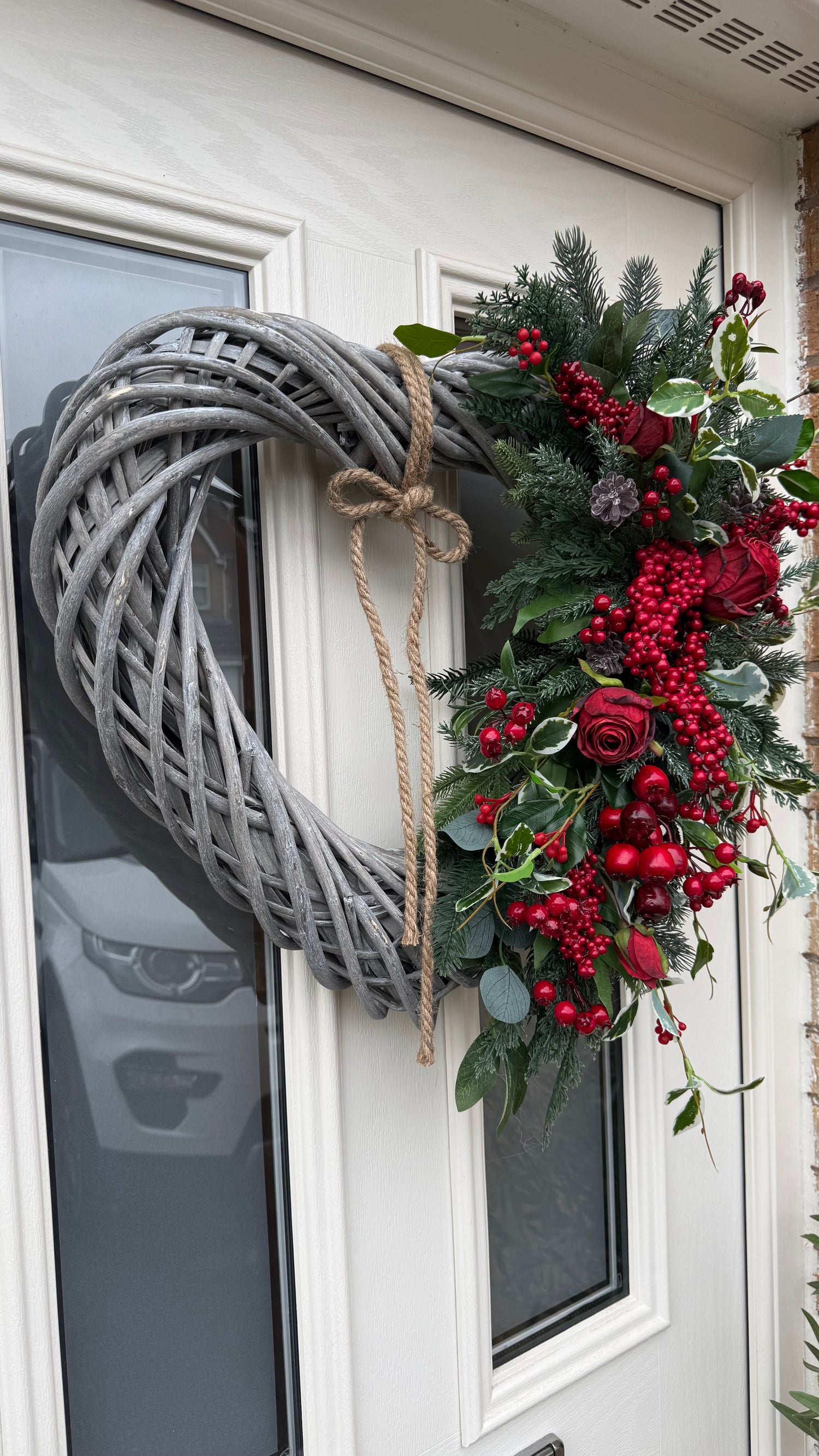 This stunning wreath is handmade on a xl wicker heart base, using high quality artificial flowers and foliage.