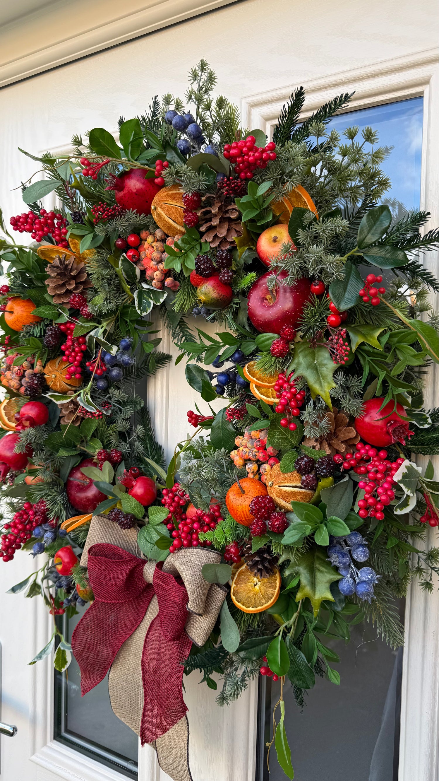 This stunning wreath is jam packed full of festive fruits, a mixture of dried and artificial fruits and high quality foliage has been added to this design. Handmade on evergreen base.