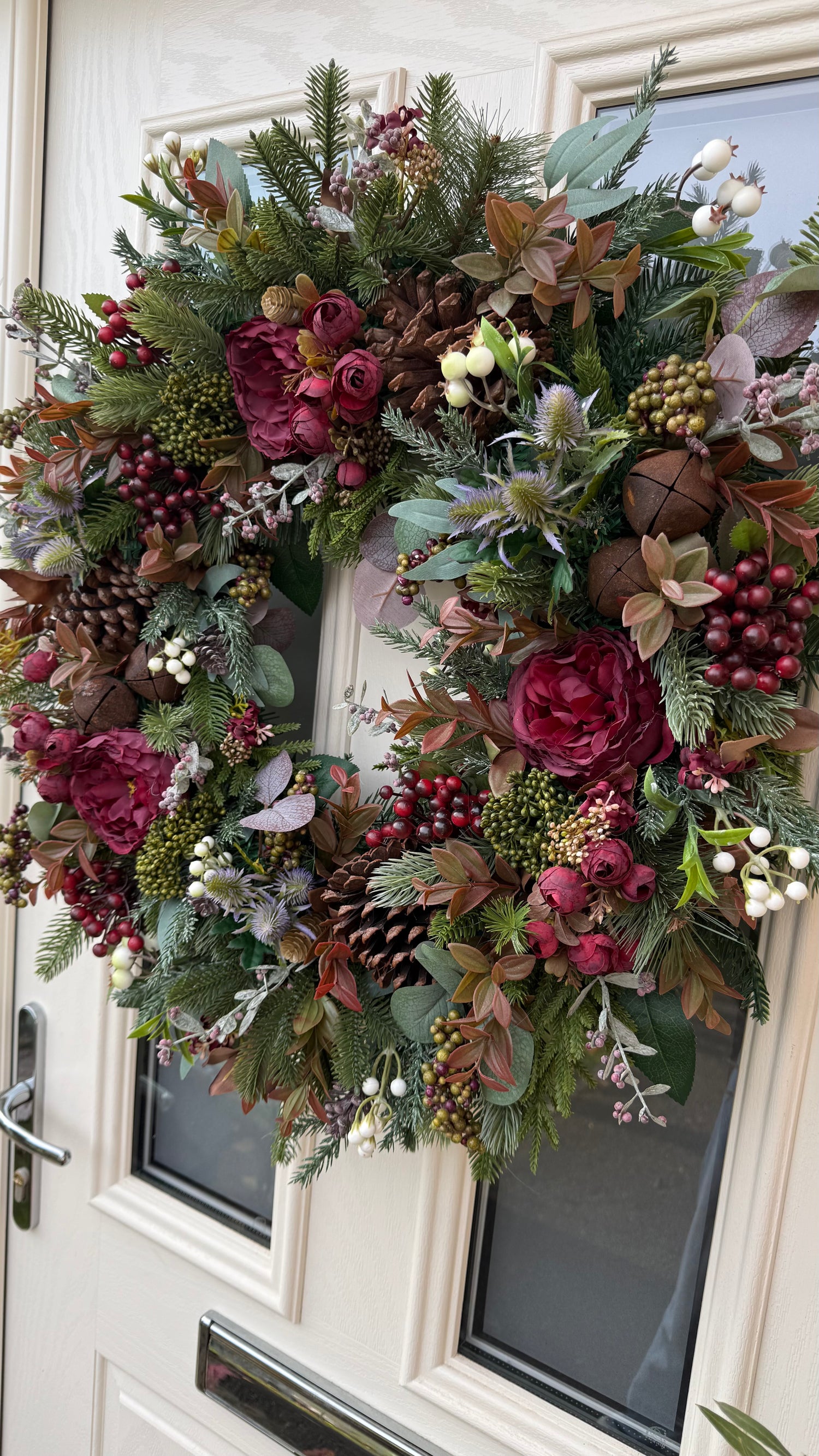 This stunning wreath is handmade using high quality artificial flowers and foliage. Handmade on an evergreen base