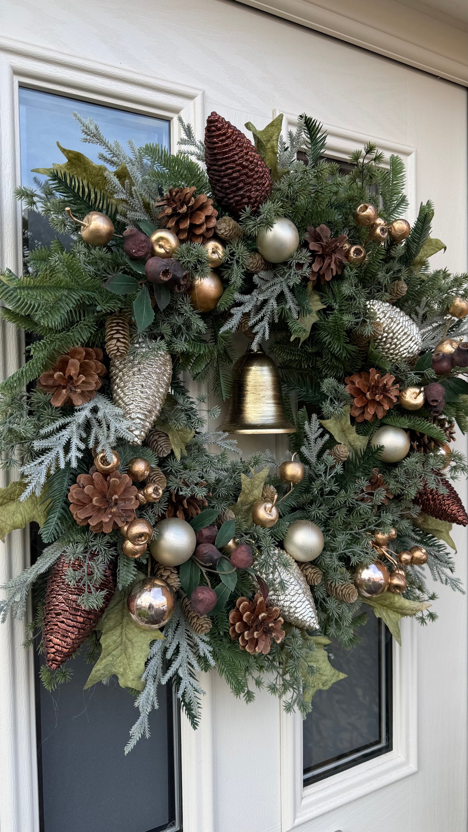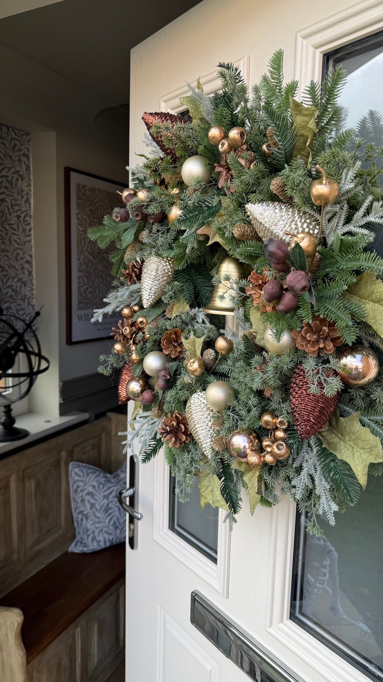 This stunning wreath is made using high quality artificial flowers and foliage, with a large metal hanging bell in the centre.